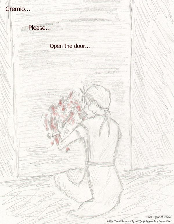 Poor Young Master. Gremio just won't open the door. Several flaws in the pic, but they are because 1) I've never drawn McDohl before 2) I suck at poses 3) I didn't have a model.