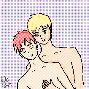 Elecman & Metalman (Megaman series) To: NK A (little late) b-day gift drawn on oekaki. Naked Elec, holding naked Metal. Rating: M |