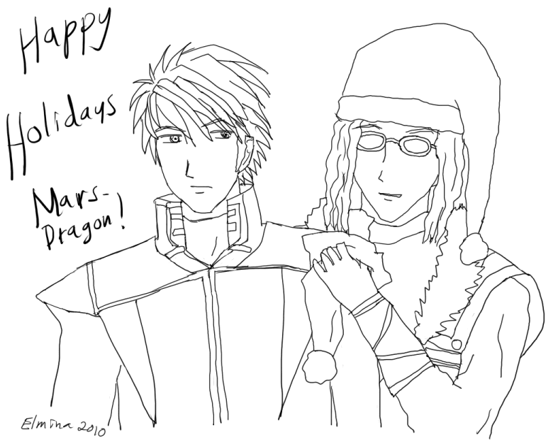 Sanger and Rätsel (Super Robot Wars series) To: MarsDragon Xmas gift to a friend. Sanger needs to give up and just wear a santa hat, Rätsel's doing it too! ...And Gilliam, but that was in another picture. Rating: E |