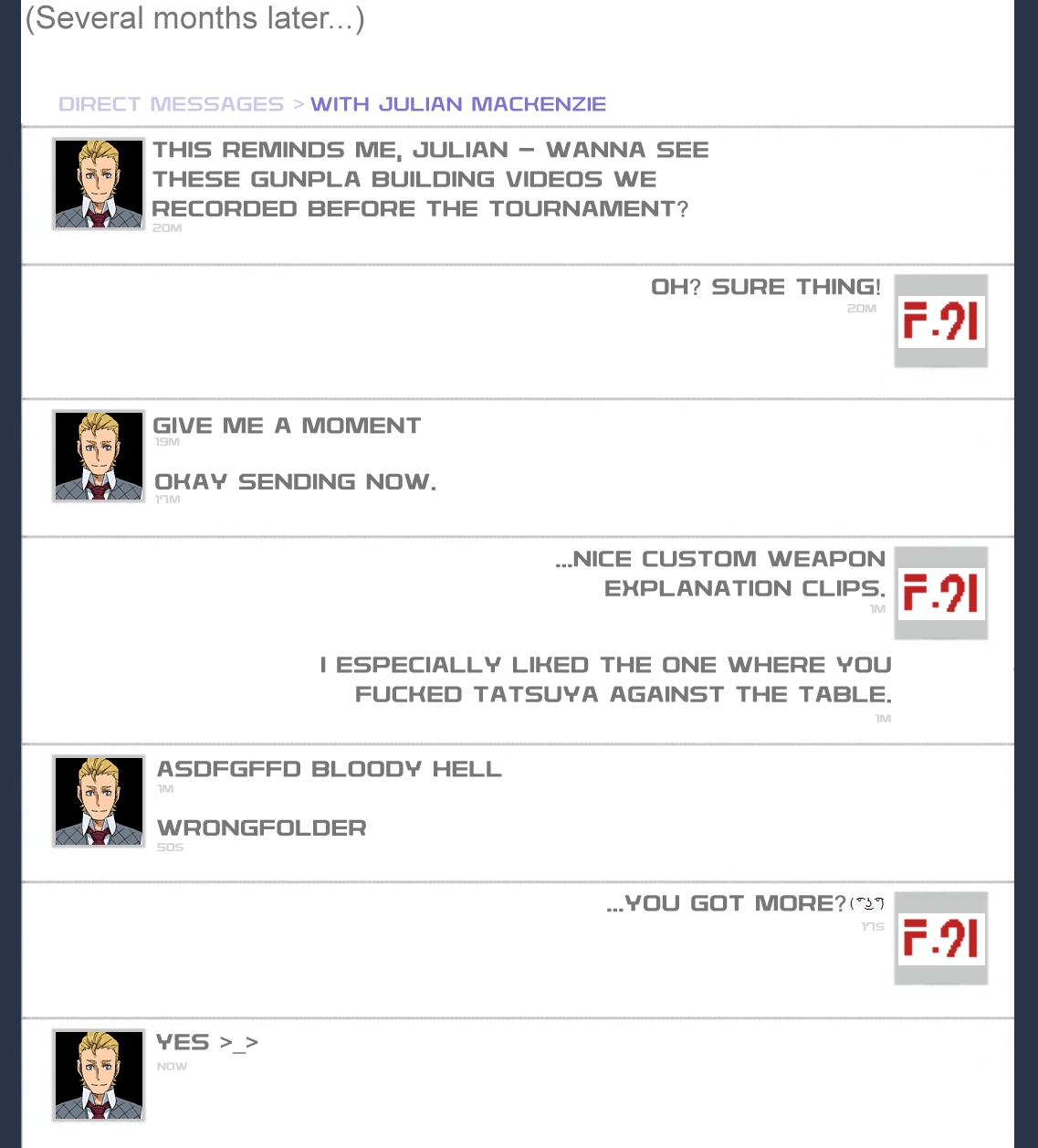 CaptureBy Lady HarkenThe video camera set-up on a tripod next to the desk in his room made him feel ridiculous, and Meijin Kawaguchi the Third stared at the thing with a dubious look on his face. Company orders or not, he wasn't sure how comfortable he was with this idea - recording gunpla building instruction videos. Certainly, the original Meijin had done so, and he had seen all those videos, but this? He folded his arms and studied the set-up once more. He would have to get used to cameras when the World Tournament started, of course, and that wasn't even the issue here. The camera itself was not the problem; besides, he had, as Tatsuya Yuuki, already fought in the last World Tournament and the fact that everything was filmed and aired worldwide wasn't anything new. He also knew that Meijin Kawaguchi the Third would, due to his status, be in the spotlight even more, which of course meant he'd have to be very careful how he acted in public. These 'gunpla building lesson' videos were an issue only because shooting any right now was useless. Kawaguchi sighed as he took off his sunglasses and circled to the other side of the camera set-up. What use was there to make any videos now, when what he had in mind for later didn't include the stoic, stern Meijin image his current act required. After the tournament, he'd have more control over the Meijin's image, but for now... "Kawaguchi," Allan's voice from behind him interrupted his thoughts. "You don't seem too happy with the whole idea. I told you already though, it's the PR department's orders, and it's not like we can go against that." He stepped closer and took a closer look at the camera. "Come on," he added in a softer tone of voice. "None of this is going online anyway, so it shouldn't be too bad. They just want to see how it would look." Kawaguchi shook his head as he returned to the desk. "I'd just rather wait until after the tournament before doing this. I don't exactly like the idea putting up this act for videos we'll never publish, but you're right." He put his shades back on and sat down in front of the building desk. "They could've at least come up with a script," he said as he turned to face the camera and watched Allan turn the thing on. "But since they didn't, I hope they don't expect this to be very deeply thought." He picked up Kämpfer Amazing and studied the gunpla. "Do you have any ideas what I could talk about?" "Hmm. Let me think for a while," Allan pondered as he checked the camera to make sure the view was concentrated on the subject. Kawaguchi watched him for a moment then smirked. Allan looked way too happy to be the one handling the camera, and he had the feeling the man wasn't really even caring what the PR department wanted, as long as he got to record some shots of his Meijin Kawaguchi. "The original Meijin was a builder, but PPSE uses the Meijin to promote Gunpla Battle and the fighting aspect," Allan stated as he peeked around the camera. "So you could come up with something about customizing your own weapons, since those are more powerful than straight builds." That didn't sound too hard, Kawaguchi had to agree, and he placed down the gunpla. "Fair enough," he confirmed. "If you think something like that is enough to make them happy, I'll do it." He turned to Allan again and watched him adjust the camera further. "Is that thing running?" Allan nodded. "It's on," he replied. "Showing you perfectly on the preview screen here, and it's pretty easy to use as well, so I can zoom it in on the gunpla for details. The PR guys said something about having one of their professionals to do the actual shootings later, but for these examples they didn't mind how we do it, so my home video attempts should be good enough. We can easily edit the recorded material later and cut out the parts we want to hand over to them." "All right, start of recording," Kawaguchi stated. He adjusted the Meijin glasses for a little and took a deep breath then turned to look at the camera. "In Gunpla Battle, the weapons you have available greatly affect your gunpla's performance," he explained in his best calm Meijin voice. "You could just settle for the factory-built weapons that are available for everyone, but if you really want to succeed in battle, you should consider customization. For example here," he picked up Kämpfer Amazing and took off one of the weapon containers, then opened it and picked out the rifle. "This rifle was designed and built by the PPSE Works Team. Its performance..." He went on for a moment about Kämpfer's weapon options then put the rifle back into the container. "Cut. Was that good enough?" Judging by Allan's satisfied smile, the answer was yes. "Perfect. I think I got all that here, although I could've maybe focused on the weapons more..." Allan studied the camera, and Kawaguchi stood up and walked around the setup to check the result. "Here, want to take a look?" Allan asked, showing the preview to Kawaguchi. "We can watch it here, or I could just copy it to my phone if you don't like the tiny preview screen." He took out his phone, and Kawaguchi waited as Allan set up the connection between the devices. "Let's see then." The video wasn't too long, and Kawaguchi watched the whole thing, even if he couldn't shake the feeling of this being completely ridiculous. His performance was indeed that of the Meijin's, which really was what bothered him. It came off so pretentious that he almost wanted to laugh. "Are you sure this is what they wanted?" He asked as Allan put the phone away. "Looks professional, alright, but I'm not very sure if it looks very natural." "I can just send that to them and ask if it's what they wanted," Allan offered. "And we can make them more example clips if this wasn't what they were after, but..." He checked the camera controls again then looked at Kawaguchi. "But we could, just for our own purposes, try another approach. Just take off the glasses and give me that same speech, but as yours